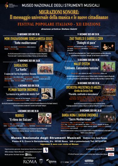 Da sabato 8 a domenica 16 novembre, e da sabato 22 novembre al 20 dicembre 2025 , con la Direzione Artistica di Stefano Saletti, torna il Festival Popolare Italiano ,12ª edizione : Sonus Mundi & Migrazioni Sonore. Due rassegne e un unico percorso tra linguaggi e culture migranti, tradizione e contemporaneità sonora. La musica come spazio di relazione, scambio e dialogo tra i popoli. Ogni concerto ha un biglietto d’ingresso di 6 euro, valido anche per la visita alla collezione del Museo: un modo per unire la fruizione culturale e la conoscenza di un patrimonio unico di strumenti e memorie sonore.