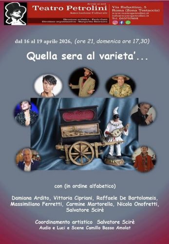 Dal 16 al 19 Aprile al Teatro Petrolini, Roma Testaccio, andrà in scena il divertentissimo spettacolo ‘Quella sera al varietà…’ .Sketch, macchiette, monologhi, personaggi comici, burlesque, bellissime canzoni napoletane e romane, gag esilaranti per due ore di allegria e spensieratezza.