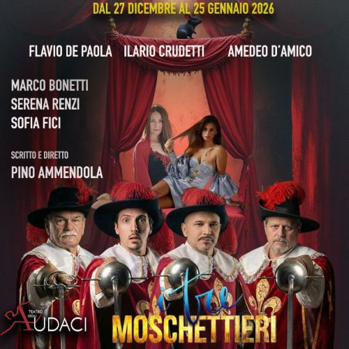 Al Teatro Degli Audaci di Roma è in scena da fine dicembre un divertente spettacolo dal titolo I TRE MOSCHETTIERI, scritto e diretto da Pino Ammendola (e non da Dumas, ovviamente!!!!). Anzi, nel caso specifico, DUMAS è addirittura il nome di una ditta specializzata in derattizzazioni!!!!! Comprensibilmente, la citazione del famoso scrittore francese è un doveroso omaggio, dal momento che il bravissimo Pino Ammendola ha eseguito una specie di spiritoso spin-off per scrivere questa parodia del celebre romanzo, realizzando una specie di teatro nel teatro; e dentro un teatro!!!! Repliche fino al 25 gennaio.
