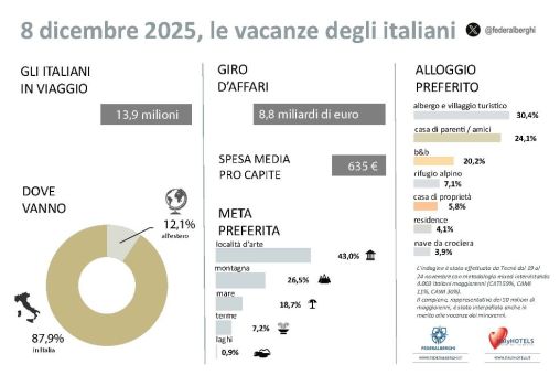 Di buon auspicio il movimento degli italiani per il Ponte dell'Immacolata anche se il costo della vita pesa sulle scelte. Saranno 13,9 gli italiani in viaggio con un giro d'affari di 8,8 mld, prima scelta il Bel Paese. Grande richiesta per i Mercatini Natalizi.