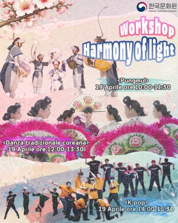 In concomitanza allo spettacolo del 20 aprile, la compagnia Show Design Group-Saeng Dong Gam terrà il 19 aprile, presso l'Istituto Culturale Coreano, una serie di workshop speciali su Pungmul (percussioni coreane), danza tradizionale coreana e K-POP!! I workshop saranno ad ingresso gratuito con prenotazioni obbligatorie. Maggiori info sulle prenotazioni sul sito www.culturacorea.it e sui canali social (Instagram e Facebook).