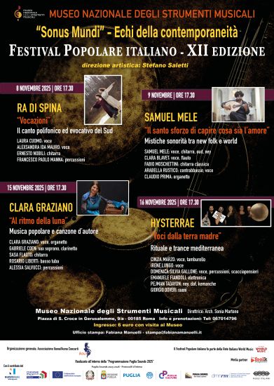 Da sabato 8 a domenica 16 novembre, e da sabato 22 novembre al 20 dicembre 2025 , con la Direzione Artistica di Stefano Saletti, torna il Festival Popolare Italiano ,12ª edizione : Sonus Mundi & Migrazioni Sonore. Due rassegne e un unico percorso tra linguaggi e culture migranti, tradizione e contemporaneità sonora. La musica come spazio di relazione, scambio e dialogo tra i popoli. Ogni concerto ha un biglietto d’ingresso di 6 euro, valido anche per la visita alla collezione del Museo: un modo per unire la fruizione culturale e la conoscenza di un patrimonio unico di strumenti e memorie sonore.
