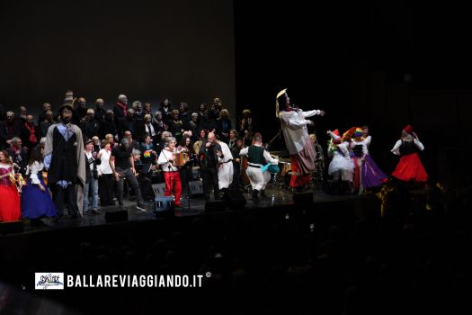 Lo spettacolo, preceduto da una sfilata di Carnevale negli spazi all'aperto del Parco della Musica , un trionfo di allegria e colori, ha regalato al pubblico tanti momenti diversi, un viaggio tra suoni , balli e ritmi. Protagonisti, accanto all'Orchestra Popolare Italiana e al Coro diretto da Anna Rita Colaianni, i danzatori popolari del gruppo Ballo! diretto da Francesca Trenta , che hanno animato il palco con armonia: vestiti di bianco, un bianco che quadro dopo quadro si è andato arricchendo di colori, i danzatori hanno onorato con delicatezza la memoria di Erasmo con un primo ballo , per poi abbandonarsi a tarantelle e danze di corteggiamento, incursioni in platea fra il pubblico , con tante altre maschere, duettando con le maschere giganti ( il leggendario brigante Mezzapenta, Angiolello e Ngiulella) ricordando le bande di briganti che animavano il Carnevale Romano ottocentesco. Figure di grande impatto ,altre circa tre metri, ideate e realizzate da Antonio Guglielmo (Monti Aurunci).
