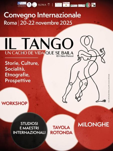 Dal 20 al 22 novembre, a cura di AirDanza, si svolgerà a Roma il Primo Convegno internazionale in Italia di Studi sul Tango- Storie, culture, socialità, etnografie, prospettive. Tra gli obiettivi promuovere e diffondere gli aspetti socioculturali del Tango, realizzare un primo studio sul Tango in Italia come fenomeno di intrattenimento sociale. Un ricco programma a più piani: convegno con relazioni e tavole rotonde con ospiti nazionali e internazionali, milonghe e workshop. Comitato organizzativo e scientifico Ornella Di Tondo, Francesca Falcone, Natalia Gozzano, Noretta Nori.