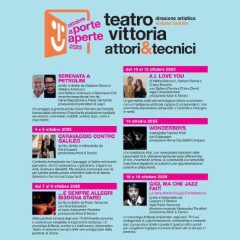 Il Teatro Vittoria di Roma, direzione artistica Viviana Toniolo, spinge sulla nuova stagione 25/26 dedicando ottobre (1-31 ottobre) a una nuova iniziativa dal titolo A PORTE APERTE. Il fine è quello, attraverso la concentrazione di ben 13 spettacoli in un mese, di rendere il teatro più accessibile e dinamico grazie alla consistente presenza di stimati professionisti dello spettacolo che, con la loro arte, arricchiranno l’atmosfera del palcoscenico del Teatro Vittoria. Teatro, musica e grande danza. Tra i primi titoli Serenata a Petrolini, Caravaggio contro Galileo, ..e sempre allegri bisogna stare.
