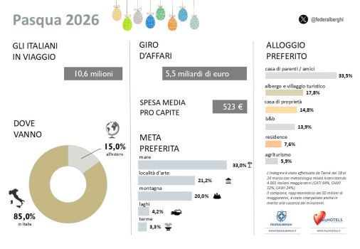 Questo il quadro del movimento turistico degli italiani per la Pasqua 2026, secondo l’indagine realizzata da Tecnè per Federalberghi. Ma che cosa conquista maggiormente gli irriducibili della vacanza in queste festività? La possibilità di rimanere nel proprio paese, recandosi al mare o visitando località d’arte, in aree di prossimità, soggiornando in case di parenti o amici, oppure affidando all’hotel la buona riuscita del viaggio.